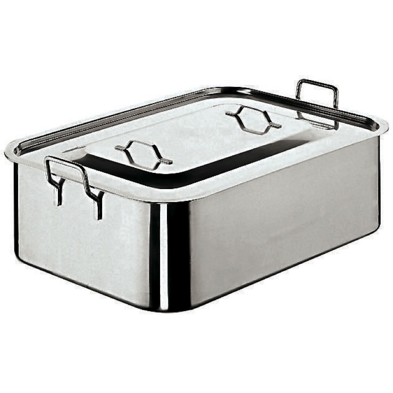 Brasiera con coperchio in acciaio inox, anticamente usata per contenere braci, č ideale per cucinare a fuoco lento ortaggi e carne. Stufati e brasati accompagnati dalla salsa di cottura che grazie al coperchio mantiene i profumi delle spezie.