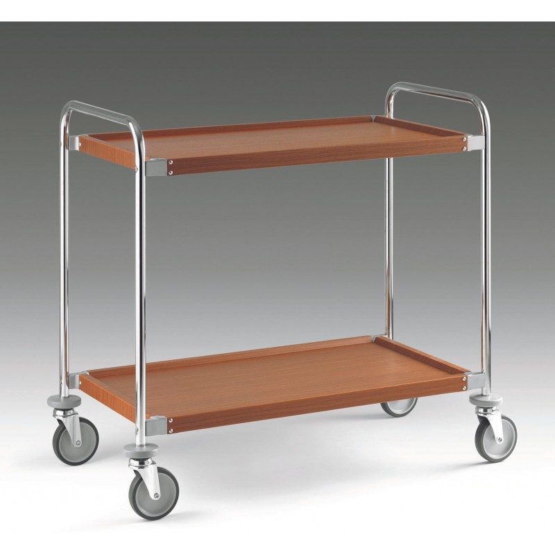 Carrelli cromati con piani in lamiera rivestita in PVC. ? Struttura in tubo tondo di acciaio cromato Ø cm 2,5 ? Piani in lamiera di acciaio ricoperti con pellicola simil legno. ? Bordo antitaglio. ? Assenza di spigoli vivi. ? Giunti angolari di fissaggio al telaio realizzati in pressofusione di alluminio con angoli interni arrotondati ? Paracolpi in gomma grigia agli angoli ? Ruote piroettanti Ø cm 12,5 ? Portata complessiva kg 80