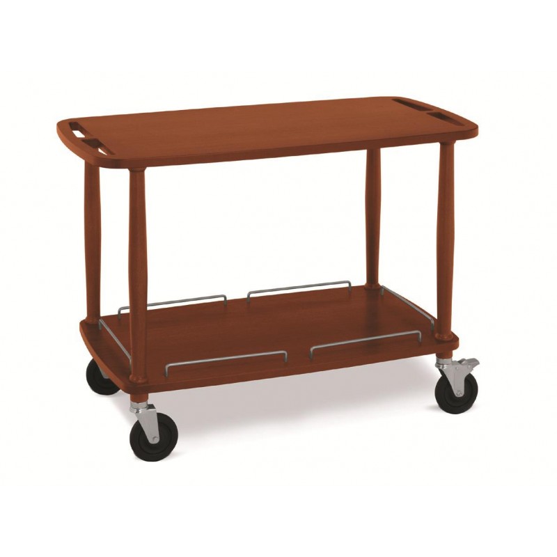 Carrello in legno serie "Budget",con 2 piani cm 94,5x55, dim. est. cm 110x56x81 h. ? Gambe tornite colore ciliegio in legno massello di faggio ? Piani in "medium density" impellicciato ciliegio con maniglie ricavate nel piano ? Ringhiere inox asportabili ? Ruote piroettanti Ø cm 12,5 cromate ? Portata complessiva kg 40