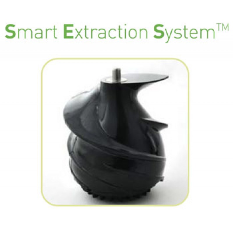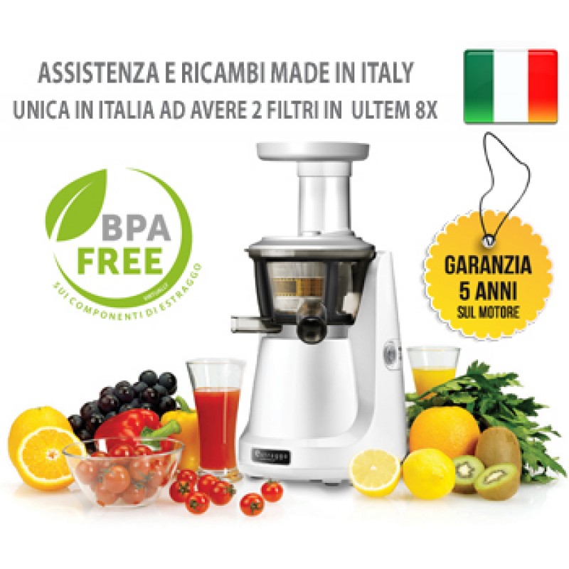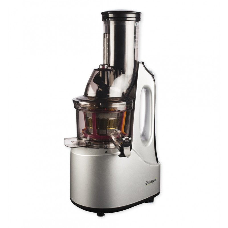 Nuovo modello, design futuristico. Disponibile nella versione color Bianco e nella versione Silver. L estrattore di Succo Vivo Estraggo PRO e' un gioiello della tecnologia piu' avanzata. Il brevetto, diffuso in 40 paesi del Mondo, e' frutto di lunghe ricerche e procedure, per soddisfare le precise esigenze di una clientela sensibile ed informata che vuole tutelare la propria salute e quella dei propri cari, attraverso una alimentazione equilibrata. A differenza dei normali estrattori, lavora a bassa velocita' (solo 80 giri al minuto) e con maggiore efficacia, ottenendo tre vantaggi : a) la produzione di un "succo vivo" ,mantenendo intatte le proprieta' nutritive della frutta e verdura, con la carica energetica salutare. b) estrarre piu' succo e quindi meno scarto c) tutto questo a a fronte di un notevole risparmio energetico. Inoltre il rumore ridotto, la facilita' con cui si pulisce lo rendono un prodotto di alta qualita', ma che puo' entrare in tutte le case. Il nuovo imbuto extralarge di introduzione della frutta e verdura di 75 mm di diametro, agevola enormemente l introduzione della stessa senza l obbligo di sminuzzarla.