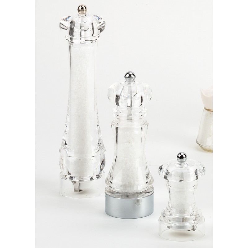 Macina sale in acrilico cm.18 con SALE MARINO DI CIPRO.Delicati fiocchi di sale marino di Cipro,di forma piramidale, prodotti in modo naturale delle acque del mediterraneo.Consigliato come sale da tavola, su insalate, verdure e cruditè.