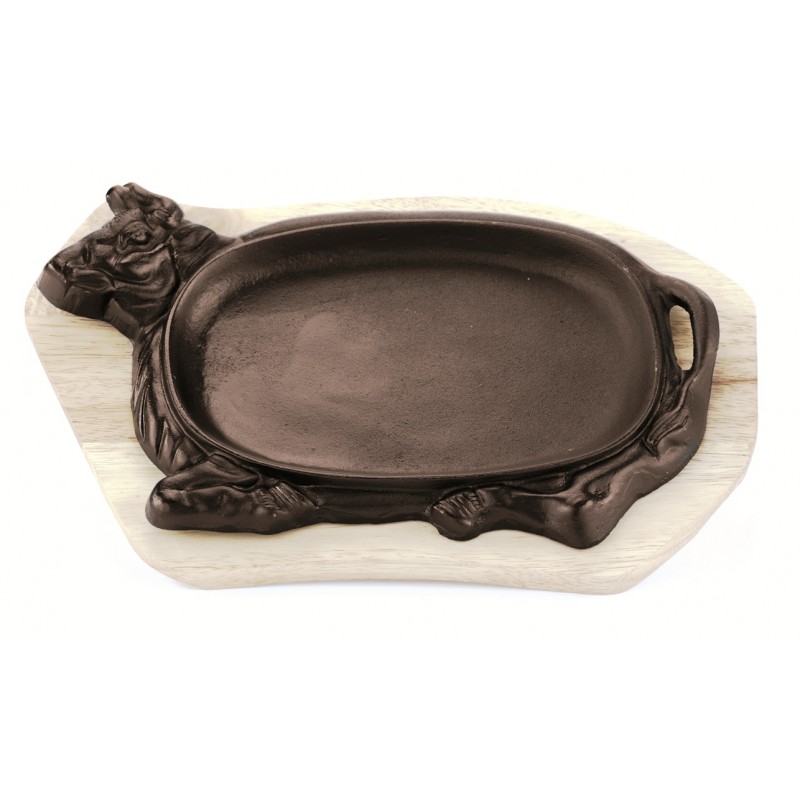 Piatto a servire in ghisa con vassoio di legno. Si cuoce il cibo sul piatto di ghisa e si serve direttamente a tavola. Cm. 22x15 Ext. 33,5x22