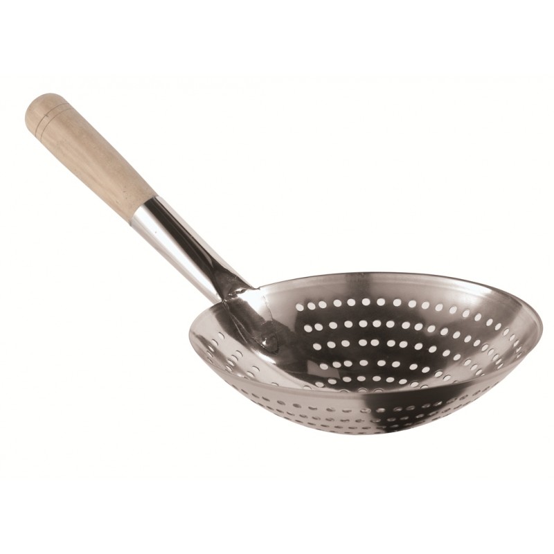 Schiumarola in acciaio inox e legno naturale. Usata per rimuovere cibi fritti o lessi dai wok.