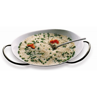Risottiera con ciambella termica utilizzabile per mantenere a lungo le temperature calde o fredde.E' possibile ritirarla nelle finiture "Oro Nero" o "Ice Oro".La speciale finitura non è ottenuta con metodi tradizionali come verniciatura o bagno galvanico, ma con un processo di impiantazione molecolare a base di titanio, frutto della ricerca aerospaziale.Il prodotto è garantito per il lavaggio in lavastoviglie, non si macchia, non si ossida e resiste alla corrosione.