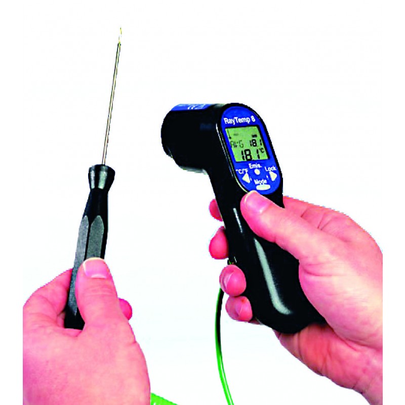 Termometro ad infrarossi cm. 4x7 scala 0,1°C , range -60°C +500°C . Sonde acquistabili separatamente, in 2 tipologie, per liquidi e cibi semisolidi e per pesce gamberoni o altri cibi delicati.