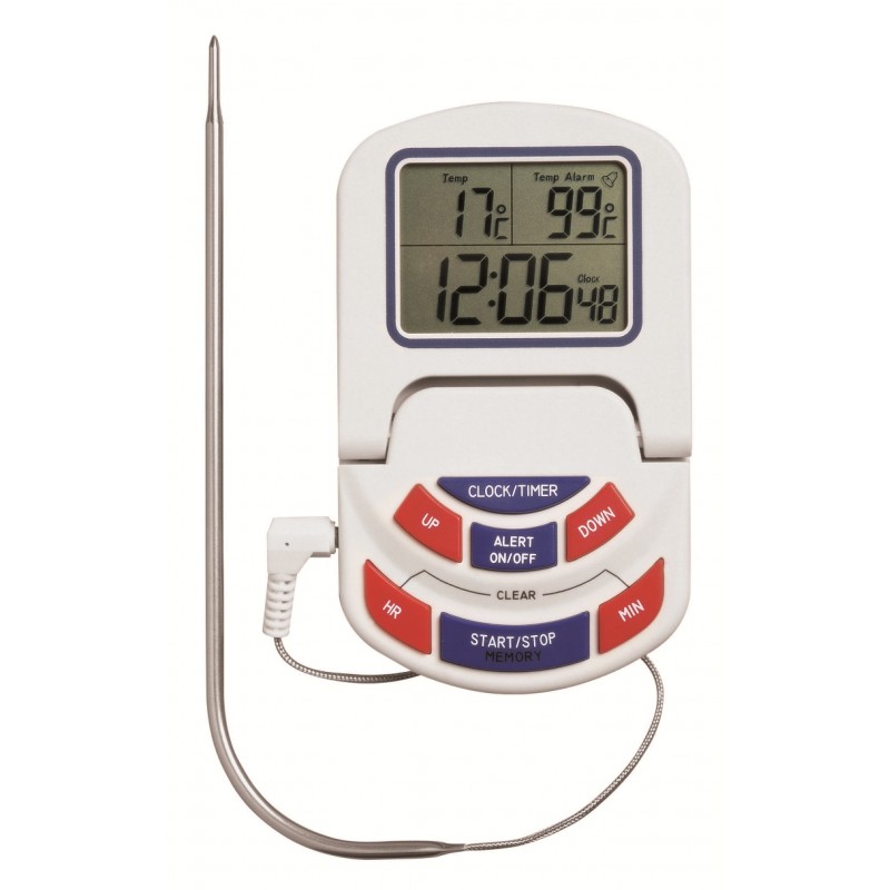 Timer 23h 59m 59s con allarme acustico. Fornito con sonda ada alta temperatura e 2 mt di cavo. Penetrazione sonda 15cm. Cm. 13x7 scala 1°C, range 0°C +300°C.